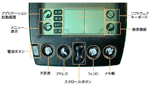 液晶の下部、Graffitiエリアにあるボタンは、登録アプリケーションが表示される「ホーム」ボタン(左上)、アプリケーションのメニューを開く「メニュー」ボタン(左下)、ソフトウェアキーボードを表示させる「キーボード」ボタン(右上)、検索を行なう「検索」ボタン(右下)がある。