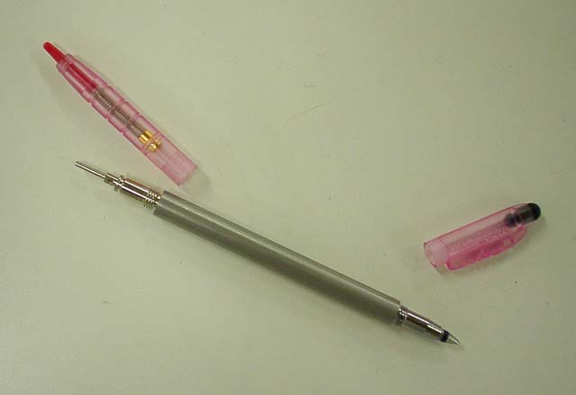 リセットピンは、Palm III/Workpad標準のペンのようにプラスチックではなく、金属製。間違って折ることもない(実はWorkPadのペンでは、リセットピンを購入早々曲げてしまった……)。このリセットピンは、根本が四角になっていて、ゴムチップ付きのキャップを使って回して外すこともできる(このあたりの作りが泣かせる)。これはボールペンリフィルの交換用で、もちろん交換用リフィルもパイロットから発売されている。