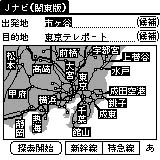 起動画面。これは関東版のデータを読み込んだところ。出発地、目的地は、ひらがなを途中までいれ、候補ボタンを押すと、候補地の一覧が表示されて、そこから駅名を選ぶことができる。