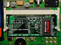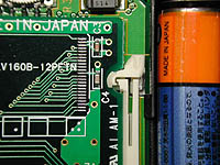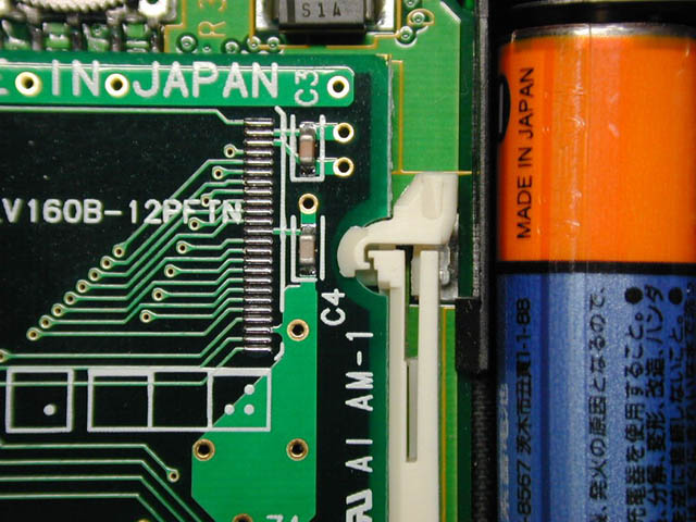 裏蓋を外すと、そこに白いスロットがあるはずだ。ここにメモリを装着するのだが、メモリの端子部分(金色の金属が見えている方)をスロットに斜め上から押し込んで、次にそれをWorkPadの基板側に倒すようにして押し付けると両サイドのプラスティックのツメがメモリに引っかかるようになる(写真参照)。最初に押し込むときには、手応えがあるまで、ぎゅっと押すのがコツ。このとき、金色の端子部分は、ソケットに覆い隠された状態になる。ここの押し込みが足らないと、倒してもツメとメモリの両端にある切り欠きの位置が合わずに固定することができない(詳しくは説明書を参照のこと)。