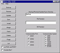 pilot-xferをGUIで操作できるようにするpgui。Visual BASICで作ってあるフロントエンドプログラム。実際の処理は、pilot-xferを起動して行なう