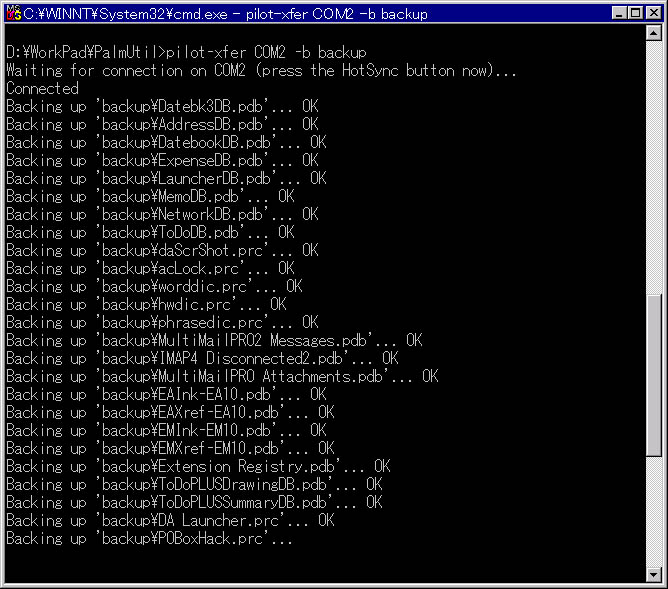WindowsNTのコマンドプロンプトでpilot-xferを実行したところ