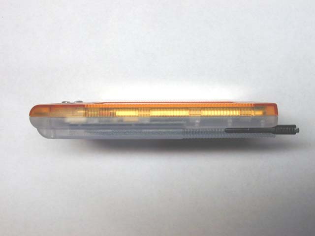 今回入手したのは、USBクレイドル付きのVisor Deluxで、色はオレンジである(Visor Deluxには、Graphite、Ice、Blue、Green、Orangeの5色ある。色を見たい方はこのページ参照)。全体は、透明なプラスチックでできており、正面には色が付いているが、背面は、白みがかった透明色(ICEと呼ばれる)のプラスチックでできている。また、本体には、取り外し可能なICE色のカバーが付属しており、これを装着することで、液晶保護や移動中に誤ってボタンが押されることなどを防ぐようになっている。また、このカバーは、Visor使用中には裏側に装着できるようになっている。カバー自体は、押されてへこまないように円筒を切り取ったように全体がカーブしている。このためか、背面に付けたときに、テーブルの上に置いてもぐらぐらしないように四隅に足(ちいさな出っ張り)が付いている。なお、本体には、このカバーを付けた状態で装着できるソフトケースが付属している。