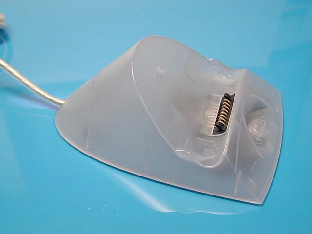 クレイドルは、やはりICE色で、ケーブルも透明なもの。クレイドル自体は、上から見ると楕円を短径方向で切断したような形で、後ろ側に大きく張り出す形状。ケースが透明なので中が丸見えだが、コネクタ付近に部品があるだけで、ほとんど中身は空のようである。