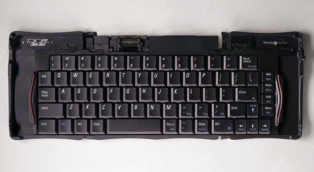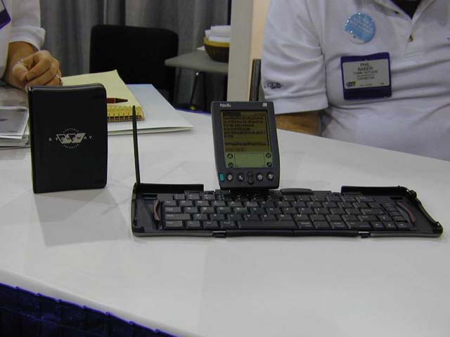 実は、上に挙げた以外にもPalm用のキーボードがある。それがThink Outside社のStowawayである。これは、コンパクトに折り畳むことができるフルサイズキーボードで、Palm/Pilotのほか、Visor用やWindows CE Palm-Size PC用もあるという。出荷は、2000年の早いうちということで、まだ、出荷はされていないようである。このThink Outsideは、米国で開かれたCESに出展しており、今回、CESの取材で実物を見ることができた。畳んだ大きさは、Palm IIIよりも一回り大きく、のばすと、ちゃんとしたフルサイズキーボードになる。