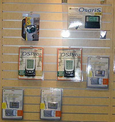 パームサイズやハンドヘルドサイズのPDAが並ぶOregon Scientificのブース。右上のOSarisは、EPOCを採用している。OSProは、かなりPalmに似ている。下段にあるCard Size Organizerは、REX似だが、PC接続アダプタとセットになっており、PCカードにはなっていない。どれも英語版だが、日本では販売しないのだろうか?