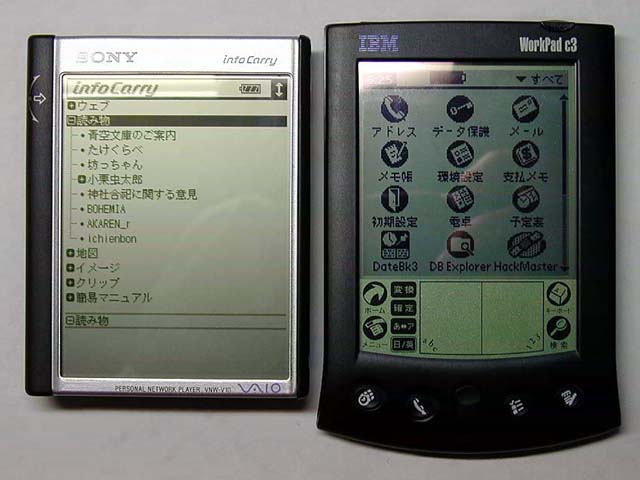 InfoCarry自体は、使い勝手も悪くないし、なによりもテキストを読むのに適当な解像度がある。実際、青空文庫なんかは、表示される文字数も多く、Palmシリーズよりも読みやすい。Palmシリーズもこれだけの解像度があればと感じてしまう。