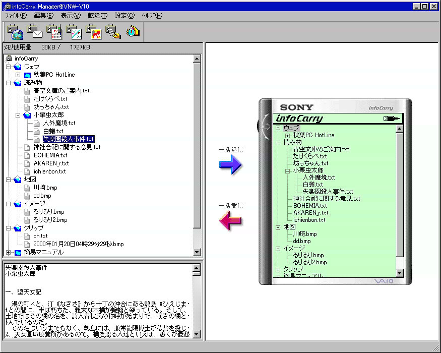 InfoCarry Managerは、左側にPC上のハードディスクにある各種情報が表示され、右側に、InfoCarryのグラフィックが描かれている。InfoCarryを接続すると、そのメモリ内のツリーがここに表示される。ソフトウェア上は、この2つの領域の間でデータのコピーを行なうことで、実際の転送が行なわれる。なお、PC上にある情報は、InfoCarry Managerからプレビューしたり、削除することは可能だが、このソフトで編集はできない。使い方としては、すでに加工の終わったデータをInfoCarryに取り込むかたちになる。