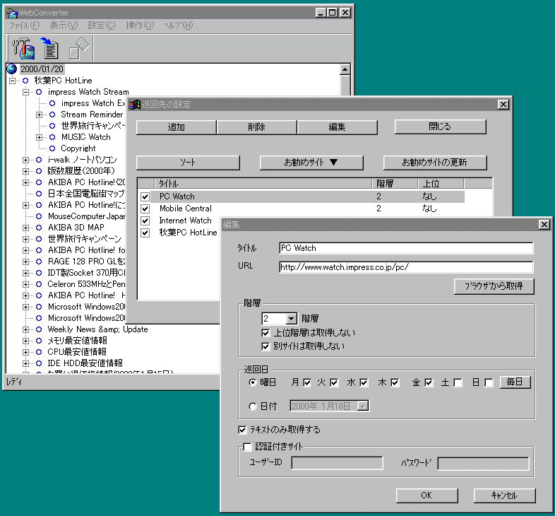 ページの取得では、Web巡回ソフトのように、テキストのみの指定(指定しないとページ内の画像ファイルも変換して取り込む)、リンクの深さ、上位リンクや外部サイトへのリンクを取得するかどうか、巡回日時(曜日もしくは日付の指定)などの条件が設定可能。
