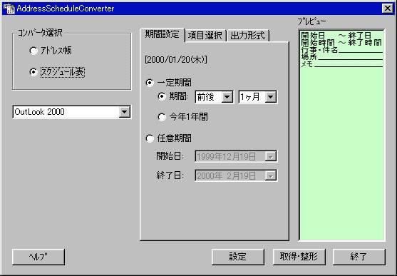 AddressSchedule Converterは、Outlook(97~2000)、Lotus Organizer、Netscape Communicator(アドレスのみ)、Outlook Express(アドレスのみ)に対応し、アドレスやスケジュール情報を取り込んで、テキストファイル化する。スケジュールは、予定の開始日やメモといった項目を選択でき、日毎、週間、月間の形式でファイルを作成できる。アドレスも、勤務先電話番号などの各種項目を選択してテキストファイル化する。