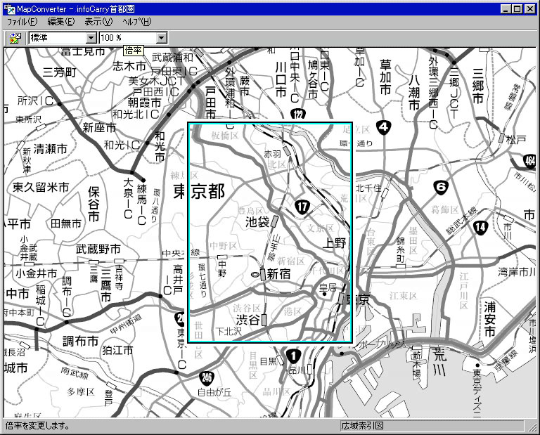Map Converterは、付属の地図(首都圏、東海、近畿、広島、九州、仙台、札幌)をインストールしたのち、そこからの切り出しを行なうもので、地図は、1万分の1~7万分の1までがあるが、各地区内のすべての領域で1万分の1の地図が用意されているのではなく、主要なところのみ、詳細な地図が用意され、周辺部は、粗い地図となる。たとえば、首都圏では、山手線の内側ぐらいは、1万分の1で表示可能だが、その外になると2万分の1の地図になる。実際には、各地区がビットマップファイルとして保存されており、それをソフトウェア的につなぎ合わせて全体を構成しているようである。