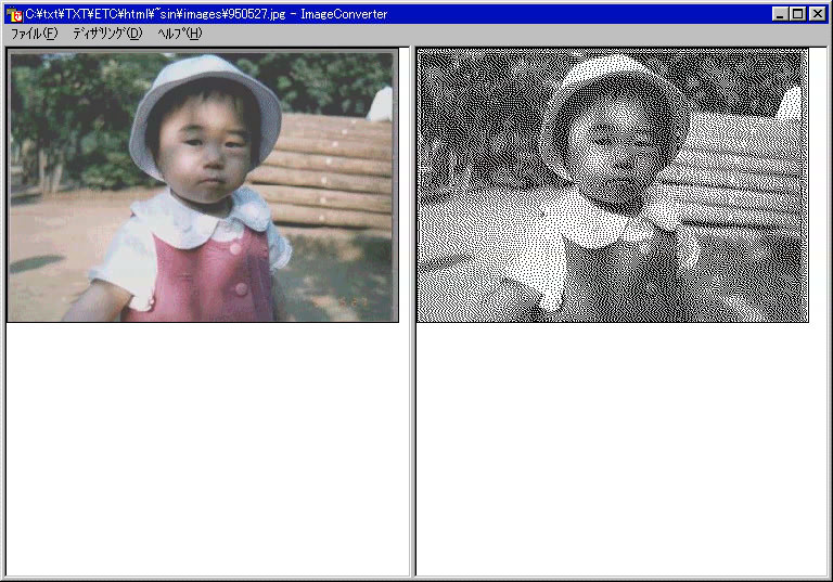 Image Converterは、JPEG、GIF、BMP、TIFF、PNG、PICT、MetaFile形式などのファイルを白黒(二値)BMPファイルに変換するもので、変換時のディザー方式の選択が可能。