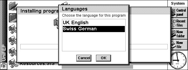 PsiWin(またはMacConnect)がインストールされ、問題なく動作していれば、UniFEPの導入はインストールファイルをダブルクリックするだけで、自動的にインストーラーが起動。あとは指示に従うだけだ。注意点としては、言語が表示されるダイアログが出た時は、 Swiss/Germanを選択することくらいだ(ROMのバージョンによっては違う表示が出るが、その時はとりあえずEnglish以外を選択すればOKだ)。