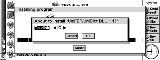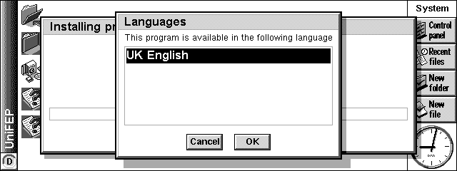 パソコンを通じてのインストールをする場合には、CDドライブを装備したパソコンに、UniFEPのCD-ROMを入れ、PSIONとパソコンを、PSION本体に付属のシリアルケーブルで接続する(インストール時には、赤外線でなくケーブルで接続した方が安心だ)。もちろん、インストールの前にあらかじめ、パソコンとPSIONを接続するソフトウェアが入っている必要がある。Windows環境の場合は「PsiWin」がPSIONに標準で付属しているが、Mac環境の場合は、単体で別売されているソフト「MacConnect」を購入しなくてはならない。