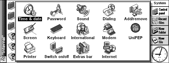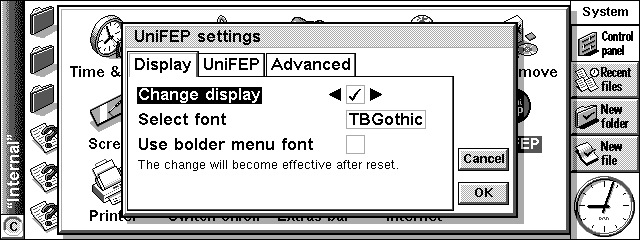 さて、インストールが無事完了すれば、ControlPanel上にUniFEPのアイコンが現われる。これをダブルタップして、Change Displayにチェックを入れて再起動すると、UniFEPが起動し日本語が表示可能な状態になる。