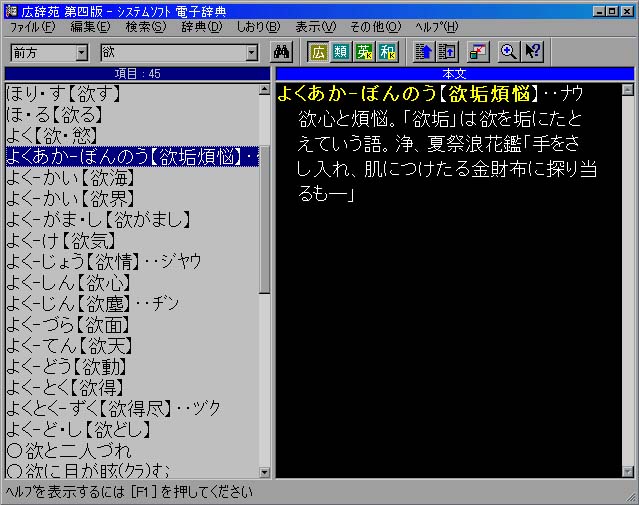 ちなみに、このソフト、仕事上で語句の表記等の確認にも使っているが、どちらかと言えば前述の「コレを今すぐどーしても知りたい!!」という欲求解消のために使っている。何かを読んでいたり考えていたりして、コトバ的な疑問がわいた瞬間使うという感じだ。