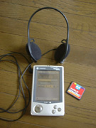 筆者の持ち歩き用セット。カシオペアE-500、ステレオヘッドフォン、64Mバイトのフラッシュメモリ。お出かけするときは、忘れずに携帯している。ただ、付属のケースに入れてバッグに入れておくと、振動でボタンが押されてしまうこともある。ハードケースがあればいいんだけどね。 |