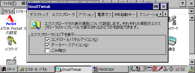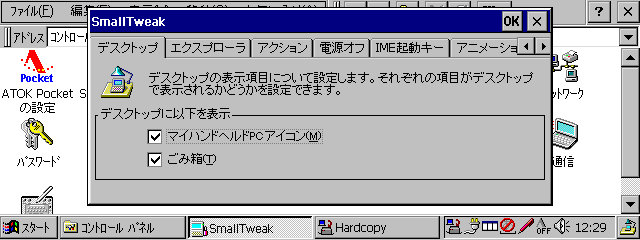 デスクトップに表示されるオブジェクトについての設定を行なう。デフォルトではデスクトップにはマイハンドヘルドPCとごみ箱が表示されるが、デスクトップに表示されたそれぞれのアイコンを表示したり、非表示にしたりすることができる。