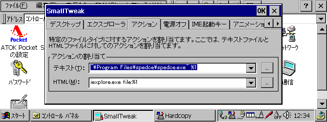 テキスト形式のファイルとHTML形式のファイルについてのファイルタイプの割り当てを変更する。デフォルトでは、テキスト形式のファイルをダブルタップすると、PocketWordでファイルが開かれてしまう。また、同様にHTML形式のファイルをダブルタップすると、Pocket IEで表示されるようになっている。アクションに関する設定では、テキスト形式、HTML形式のそれぞれのファイルが開かれるときに、どのアプリケーションを使って開くのかを任意に設定することが可能だ。