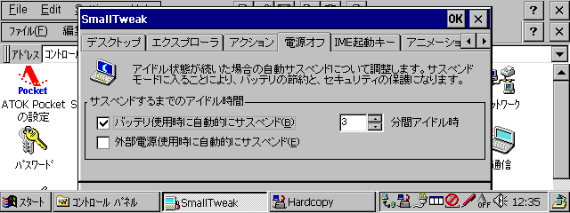 アイドル状態が続いたときの自動サスペンドに関する設定。アイドル時間がどれくらい経過したときにサスペンドに入るのかをバッテリ使用時、外部電源接続時のそれぞれについて設定することができる。たとえば、バッテリ使用時のときに5分間アイドル時にサスペンドするように設定すると、バッテリで使用しているときに5分間CEマシンを利用しないと自動的にサスペンドされる。バッテリの節約をしたいときに有効だ。