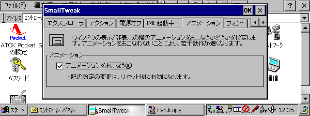 CEマシンではウィンドウを表示したり非表示にするときに、アニメーションが行なわれる。このアニメーションを表示するかどうかの設定だ。デフォルトではアニメーション表示されるが、アニメーションの表示をオフにすることができる。ちなみに、アニメーション表示をオフにするとマシンの動作が若干向上する。比較的遅いCPUを搭載したハンドヘルドPCなどではアニメーション表示をオフにすることで快適に使うことができるようになる。