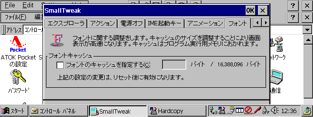 フォントキャッシュに関する設定を行なう。フォントキャッシュとは画面にフォントを描画するときに利用されるキャッシュで、CEのデフォルトは4KBのキャッシュが使われている。