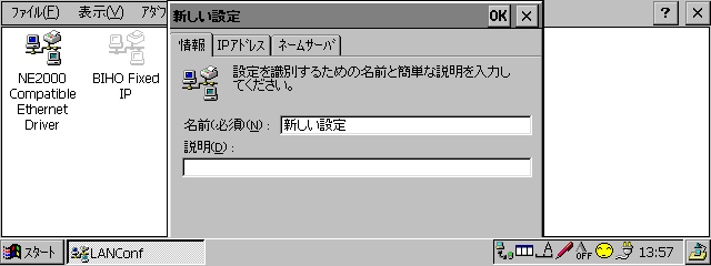 こうした面倒な作業を肩代わりしてくれるツールが「LanConf」。LanConfを利用すると、複数のネットワーク設定を作ることができるようになる。たとえば、この設定はIP固定でサブネットマスクはこれ、こっちの設定はDHCPからIPを持ってくる設定といった感じ。LANカードの設定はこうして作成した設定の中から1つだけ選ぶことができるようになる。つまり、あらかじめ設定さえ作っておけば、接続環境が変わったとしても設定を選ぶだけで接続できるようになる。わざわざIPアドレスやサブネットマスクといった情報を入力する必要は全然ないというわけだ。これは本当に便利。Windows CEの標準機能としてサポートされていても不思議じゃないほど便利なツールなのだ。