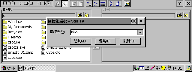 SolFtpは、Windows CEで動作するFTPクライアント。リモートとローカルの2つのウィンドウのオーソドックスなユーザーインターフェイスを採用しているため、操作は非常にやりやすい。たとえば、Anonymous FTPサイトからファイルをダウンロードすることもできるし、Windows CE上で作成したHTMLファイルや画像ファイルをWebサーバーに転送して、ホームページを更新するといったことも可能だ。