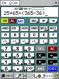 QCalcは数式を入力して計算するタイプの関数電卓。数式通りに入力を行ない「EXEC」キーを押すと、計算結果が表示される。