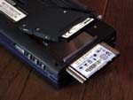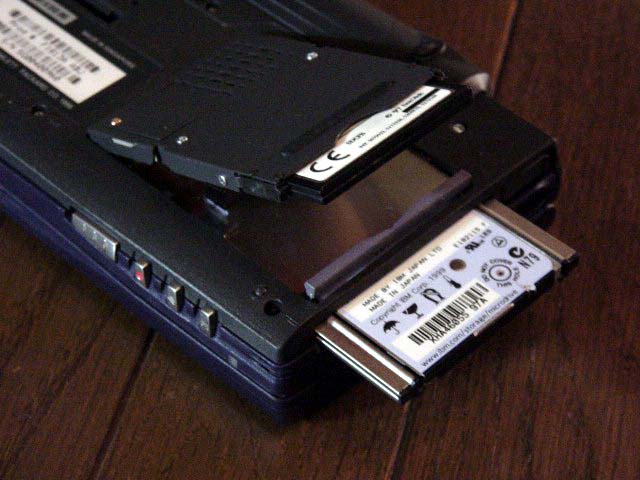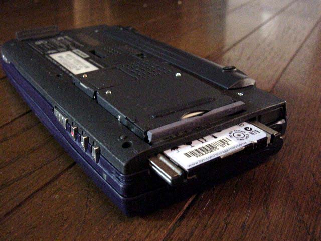PCカードを本体に装着した所。CFカードスロットの部分の厚さだけ本体の裏から浮き上がっている。ちなみに、写真奥に見えるのは折りたたみ式の足だ。 |