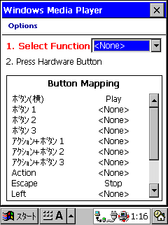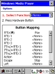 というわけで、WMPではPalm-size PC本体のボタンにそれぞれの機能を自由に割り当てられるようになっている。デフォルトでは横のボタンに再生が割り当てられているだけだが、それぞれのボタンに機能を割り当てることによって、画面をタップせずに音楽再生をコントロールすることができるようになっている。実際にボタンに機能を割り当てるときは、割り当てたい機能を選んで、ボタンを押すだけなので簡単だ。