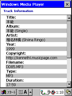 音楽ファイルの情報を表示。こちらも情報に日本語が含まれていても正しく表示される。 |