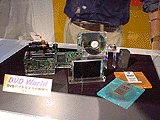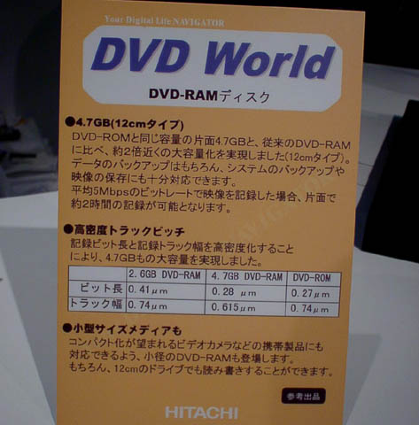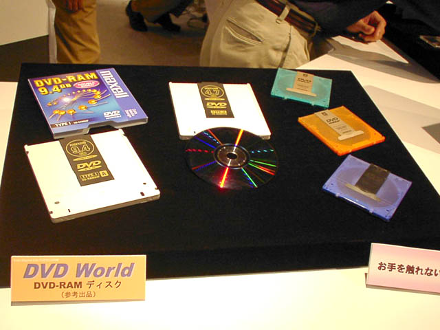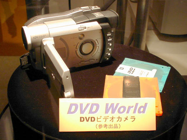 展示されたDVDビデオカメラのメディアは3.5インチと12cmDVDメディアよりひと回り小さい。3.5インチDVD-RAMメディアについては、現在規格を策定中だという。このため、製品化の際の記録容量は正確なところは言えないが、12cmサイズの1/3程度とのことだ。ちなみに展示されていた12インチDVD-RAMメディアの容量は片面タイプで4.7GB、両面タイプで9.4GB。この1/3というと、3.5インチDVD-RAMには片面で1.5GBほど、両面で3GBあまりが記録できることになる。