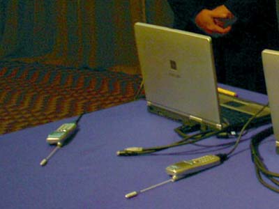cdmaOne 64kbpsパケット通信のデモに使われた、Pentium IIIを搭載した富士通のノートPCと、64kbpsパケット通信対応の携帯電話端末。このデモは11月2日から東京ビッグサイトで開催されるCOM JAPAN会場で一般公開される |