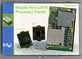 モバイルPentium IIIは、クロック400/450/500MHzの3モデルを発表。インテルは、「既存のPentium IIIコアともモバイルPentium IIコアとも違う、新しく設計したCPU」と説明した。モバイルPentium IIIは0.18ミクロンプロセスを採用、これにより同クロック(400MHz)のPentium IIと比較して、32%低い消費電力と、処理により11~89%の高性能化を実現したという(最も性能向上が著しいのが浮動小数点演算)。
