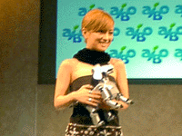 AIBOが登場し、ステージ上のディスプレイに置かれると、AIBOスペシャルサポーターの浜崎あゆみが登場。独特の語り口で、AIBOへのコメントが行なわれた。今回のAIBOには、グレイシルバーとメタリックブラックの2色が用意されており、ソニーから彼女の希望したグレイシルバーを贈呈。希望理由は「メタリックブラックのAIBOは、ちょっと恐い」ということであった。AIBOを手にとってのトークの最中には、AIBOが動き出す場面があり、まだまだAIBOに慣れておらず困ったような表情も見せてくれた。