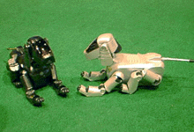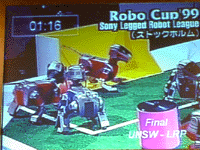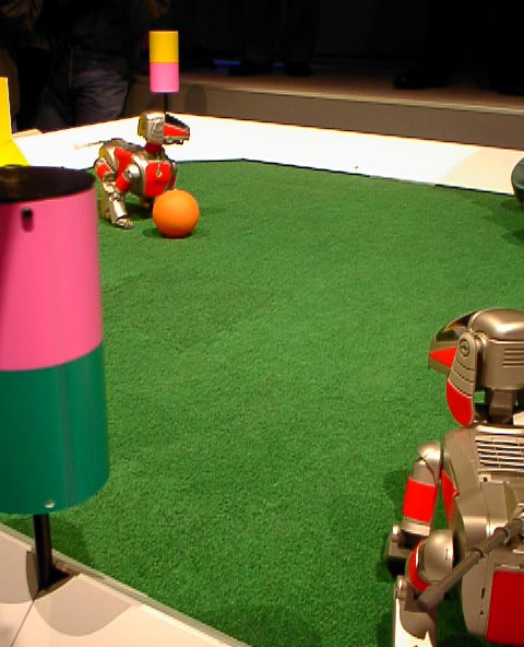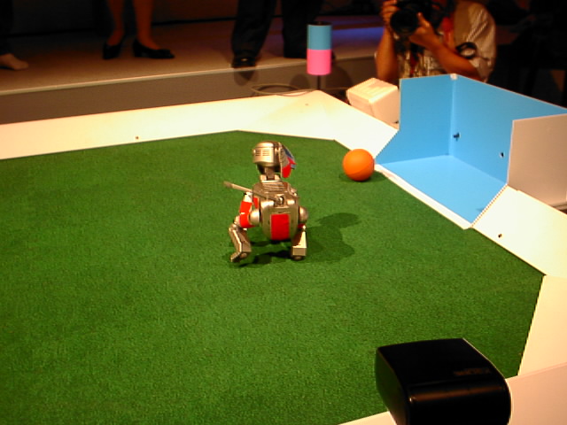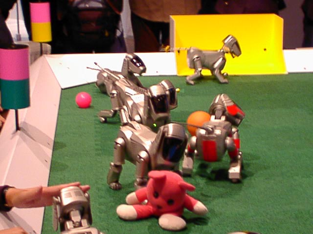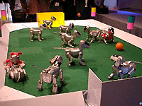 優勝したAIBOを使ってのデモ。ゴールキーパーはボールがゴール近くにくるまでは、ゴールの前に留まっている。ボールが近くにくると、ゴールを背にしてボールを押し出す。フォワードは、遠くにあるボールに近づき、うまくまわり込み、相手ゴールにボールを押し込む |