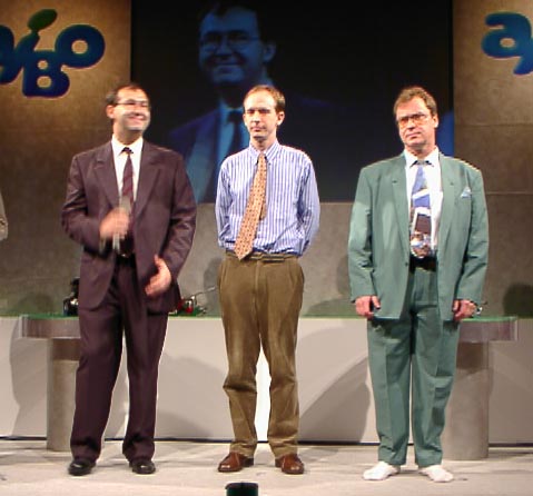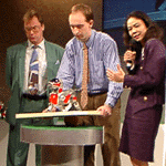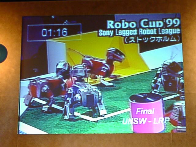 RoboCup-99での「Sony Legged Robot League」 で優勝したフランスのパリ・ロボット研究所のチーム「三銃士」によるデモンストレーションでは、実際の試合の場面のVTRを交えて解説がなされた。「Sony Legged Robot League」で行なわれた競技とは、AIBO 3体を1チームとしたミニサッカーゲーム。3体のAIBOは それぞれゴールキーパー、ディフェンダー、フォワードと機能するプログラミングが行なわれ、自律してゲームを行なう。VTRや「小さな三銃士」と呼ばれるAIBOを使ったデモストレーションを見ると、「これがAIBOなのか」と思わせるスピーディな動きで、ゲームが行なわれた。