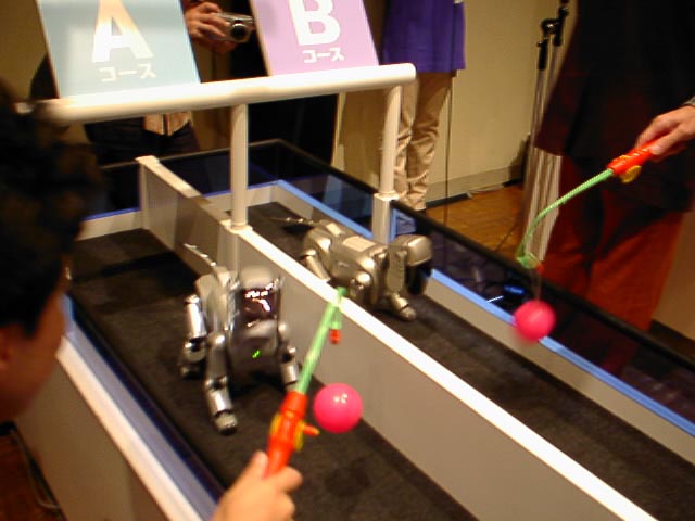 | AIBOレース。A/B/C/Dの4枠で同時にスタート、最初にゴールしたAIBOが勝利者。AIBOはピンクにもっとも反応するために、吊り下げたピンクのボールを使ってレースを行なう |