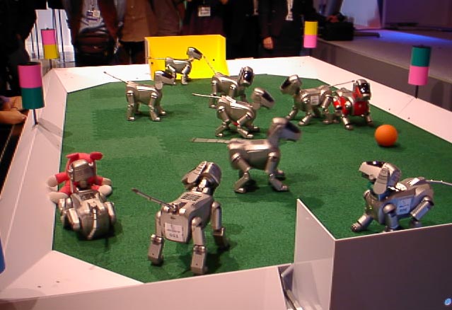 ステージ前のロボカップデモ用のスペース。オーナーが持ち寄ったAIBOが放し飼いされていた |
