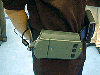 おおよかった、モバイルらしいものもあった! というわけでウェアラブルPCです。PCMCIA type2スロット2基搭載の本体(900g)、リチウムイオンバッテリー(450g)、ヘッドマウントディスプレイ(475g)の3つを身につける仕組み。CPUはPentium MMX 200MHz、メモリ32MB、HDD 2.1GBとちょっと前のノートパソコン並みの性能を備える。業務用途向けに開発されたものだが、いまのところ納入先は大学など研究開発機関が主とのことだが、業務用としては関西電力に納入実績があるそうだ。昨年のCOMDEX/Fallで発表し、当時79万8000円程度だったが、1周年記念ということで50~60万円ていどで2000年から出荷するとのこと(価格は数がまとまればもっと下げられるそうだ)。またNTTがこの製品に強い興味を示しており、共同で研究開発などを行なっているそうで、写真(下右)の首から下げる液晶ディスプレイはNTTが開発したという。製品のお問い合わせはザイブナー株式会社(http://www.xybernaut.co.jp/)までどうぞ。