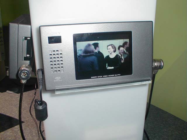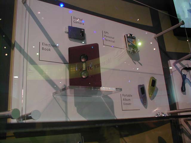 ソニーブースでは、メモリースティックとi.LINK関連製品を中心に展示がおこなわれていた。メモリースティックに関しては、先日発表されたメモリースティックウォークマンや、メモリースティックICレコーダなどが展示されていたほか、メモリースティックビデオプレイヤーも参考出品されていた。メモリースティックビデオプレイヤーは、メモリースティックに記録されている動画(MPEG1形式)を内蔵の液晶ディスプレイで再生するための製品である。64MBのメモリースティックに約6分の動画を記録できるという。今回は、あくまで参考出品という位置づけであり、そのまますぐに発売されるわけではないようだが、来年には特定用途向け(営業マンに持たせるなど)としての発売を予定しているとのことだ。