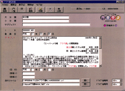 「スーパーメモ帳・アラヤ識」は文書型データベースソフトで、ひとつのファイルにメモを蓄積していく。キーワードによる全文サーチが可能なため、インデックスやメモの題名などをいちいち付けなくても文書検索ができる。また、添付ファイルの情報も格納できるため、画像や表計算シートも合わせて管理することが可能。