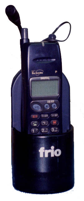 frioは、ドリンクホルダーにすっぽりと収まるタイプのハンズフリーシステム。着信を自動感知し、通話終了までボタン操作なしで通話することができる。ただし、音声で電話をかけることなどはできない。電源は自動車のシガーソケットから供給される。ACアダプターも別売で用意されており、室内でも利用できる。