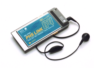 PHS LINK 64はPCカード型のPHS端末で、ノートPCのPCカードスロットに挿入すれば、これ1つで64kbpsのデータ通信ができる。付属のイヤホンマイクを利用すれば音声通話も可能。OSはWindows 95/98/NTのほか、Windows CE 2.0、Mac OS 8.1以降にも対応する。
