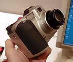 大きさは108×89×65mm(幅×高さ×奥行き)、重さは365g(電池等含まず)。単3電池4本で動作し、ニッケル水素電池なら、LCDオンによる連続撮影でも約2時間利用できる。記録メディアにはコンパクトフラッシュを採用。また、USBインターフェイスを装備しており、パソコン接続キット(10,000円)も別売で用意されている。
