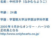 オンリー・ハーツの中村さんは1977年5月28日生まれの24歳。学習院大学法学部法学科を卒業後、オンリー・ハーツにアルバイトとして入社した。3ヶ月のアルバイト期間の後、正社員になった。「大学4年生の時に英国に1年間留学していたんです。単位はすべて取ってしまって、論文も書いてしまっていました」と中村さん。違う環境に身を置いてみたかったこと、英語を喋れるようになりたかったことが留学の理由だという。
