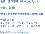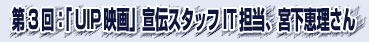 今年の6月に空前の大ヒットを飛ばした冒険活劇『ハムナプトラ2 /黄金のピラミッド』の配給を行ったのがユナイテッド・インターナショナル・ピクチャーズ・ファー・イースト(UIP映画)だ。今回紹介するのはUIPの宣伝スタッフIT担当という宮下恵理さん。「8月11日には『ジュラシック・パークIII』が公開されます。『ハムナプトラ2/黄金のピラミッド』の上を狙いますよ。興行収入でとりあえず100億円が目標です。この夏はUIPで始まり、UIPでシメます!」とその意気込みはすごい。