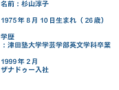 学生の時(97~98年)に休学をして1年間イギリスのウォーリック大学に留学をしていた。大学では英文学科にいたということで「ある程度、英語はできる状態」だったという。「とにかく英語を話せるようになりたかったんです。結局、英語でコミュニケーションが円滑に行えるということは、今の仕事にとても役だってます」。 そんな杉山さんは「映画が好きで、映画関係以外の仕事は考えていませんでした」と話す。ザナドゥーへの就職も「新聞に求人広告が載っていたので、応募した結果入社が決まって、とってもラッキーでした」と嬉しそうに言う。やはり、好きな道を頑固に志す人にはいつか必ずチャンスが訪れるのか。「就職に関しては、友人や両親にも、どうするの?と心配されていましたから、ホントにラッキーでした。たぶんあのときに運を全部使っちゃったんじゃないかと思ってます」と彼女は言うが、チャンスを確実に掴み取ったのは彼女自身の功績なのである。幸運以外の何かがなければ、自分の好きな職にはつけないはずだ。