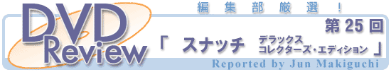 世界を熱狂させたデビュー作の成功により、リッチーは一躍時代の寵児となった。だが、映画界ではスターの彼も、エンタメ界のスパースター、マドンナと結婚したことにより、妻と絡んだ話題ばかりが伝えられている。最近では“マドンナの夫”というイメージばかりが先行して、本人の人柄や魅力があまり伝わってこないのが、ファンとしては少々残念である。 話題の2作がいずれも犯罪ものを扱ったキワモノなので、タランティーノのようなハイパー・ハイテンション・キャラなのかと思いきや、DVD特典の音声解説やメイキング映像から感じられる人柄は、穏やかな紳士といったところだ。自作を客観的に観察し、真摯な姿勢で捉えている様子には知性が感じられ、売れっ子の驕りなど微塵も感じさせない。下世話なセリフも下品にならない。残酷非道なシーンにもスタイルがある。そんなリッチー作品には、監督自身の知性がしっかり反映されていたのである。人柄だけでなく、前述の通り彼の才能は比類がない。それを証明するエピソードには事欠かない。『ロック、ストック&トゥー・スモーキング・バレルズ』で監督の才能に惚れ込んだブラッド・ピットが自らラブ・コールを送り続け、破格のギャラで念願のリッチー作品出演を手にしたというエピソードはあまりにも有名だ。しばしば俳優たちはギャラの額に関係なく作品への参加を熱望する。それは監督の才能がスターたちを魅了している場合に多く起こる。ソダーバーグ監督の最新作『オーシャンズ11』で、ハリウッドきっての高額ギャラを受け取るスターたちが夢の共演を実現させたのは、この最たる実例である。予算が多ければ作品の質が高くなり易いことも事実だが、監督に才能があれば予算の高低に関わらないというのも、また事実なのである。 ところで、音声解説の最後にはガイ・リッチーから映画制作についての爆笑アドバイスが寄せられている。映画制作を目指す人もそうでない人も、楽しみにお聞きいただきたい。
